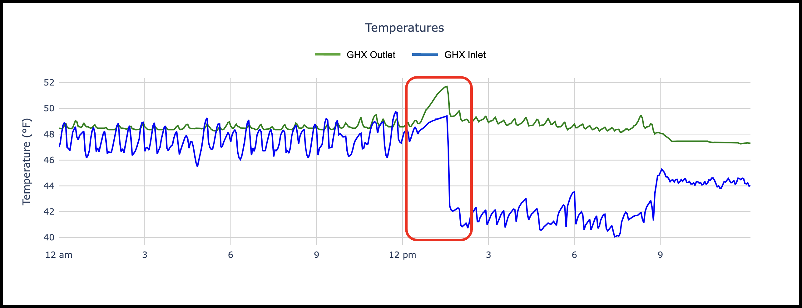 The exact time of the control switch can be seen below, with an immediate drop in the GHX temperature—enabling the GHX to take over heating instead of relying on the inefficient electric boiler.