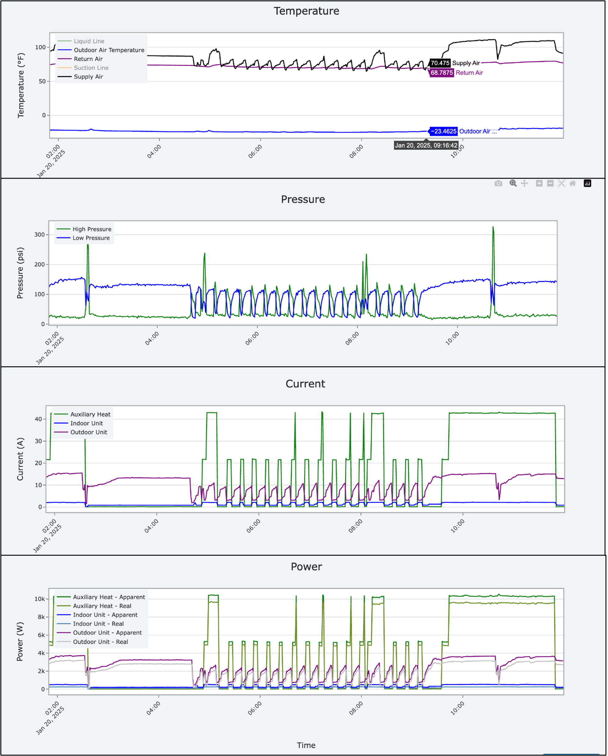 - Electrical Input: The combined real power draw of the indoor unit, outdoor unit, and auxiliary heating elements was measured.
