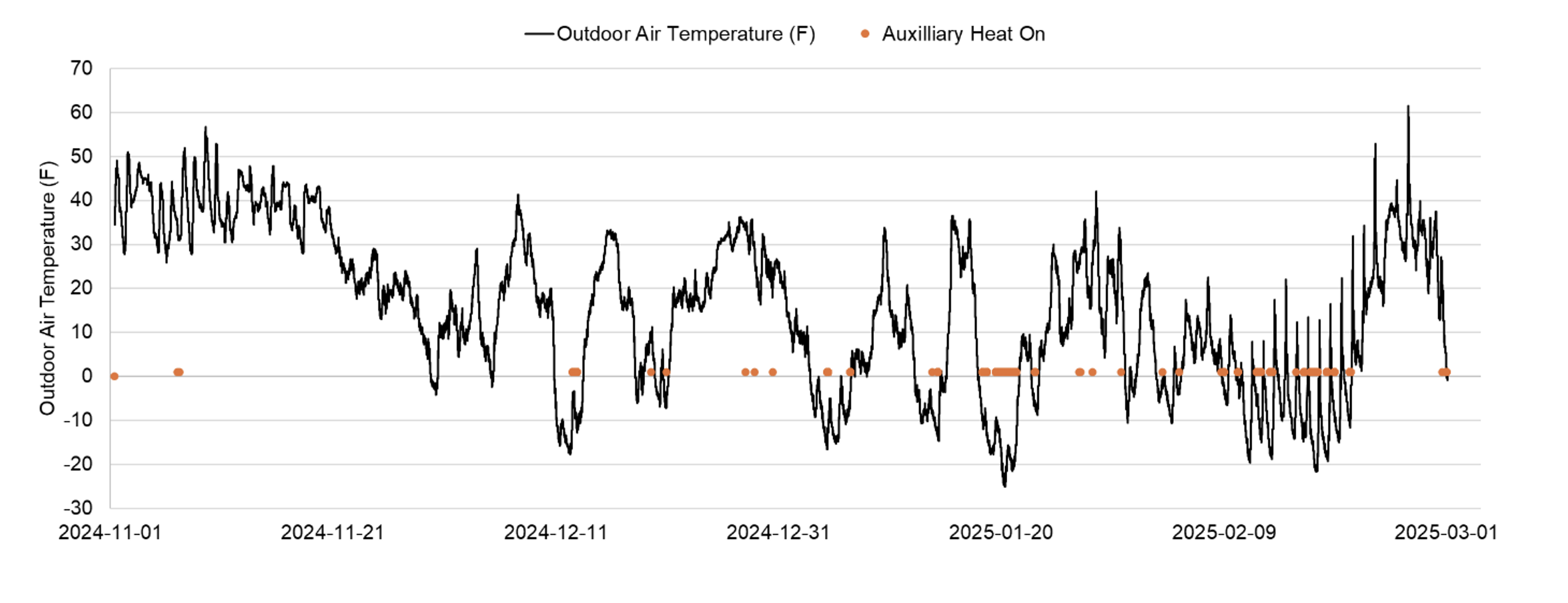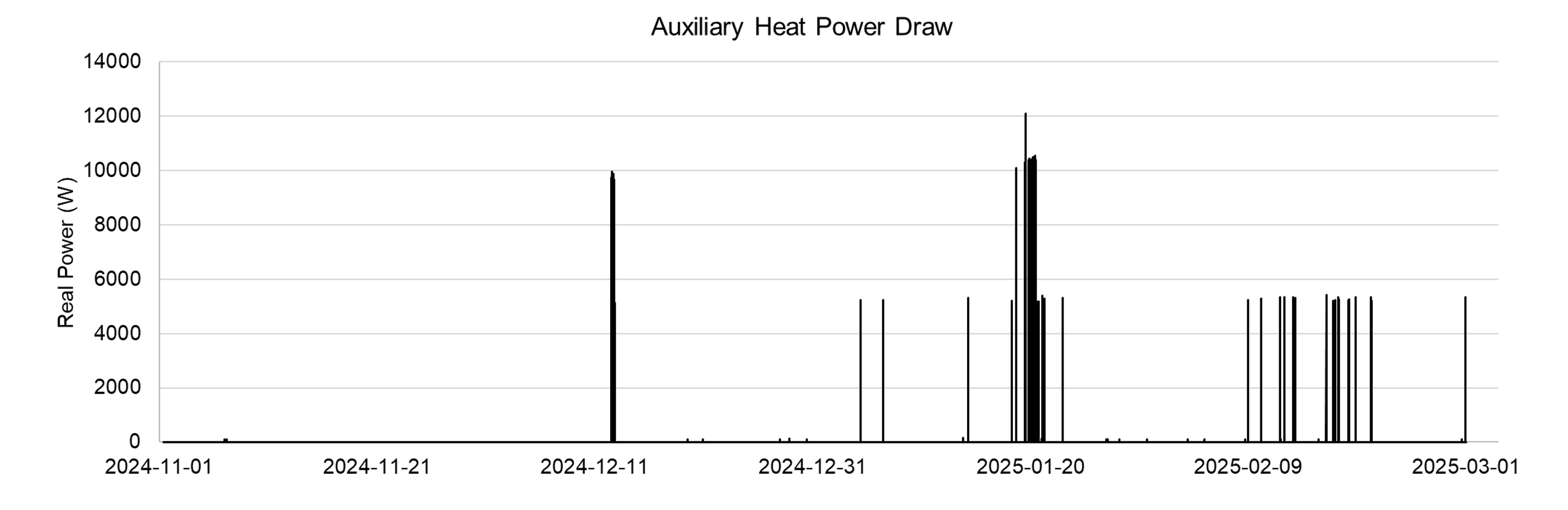 - Over the monitored period, auxiliary heat was engaged for a total of 1,272 minutes (21 hours).